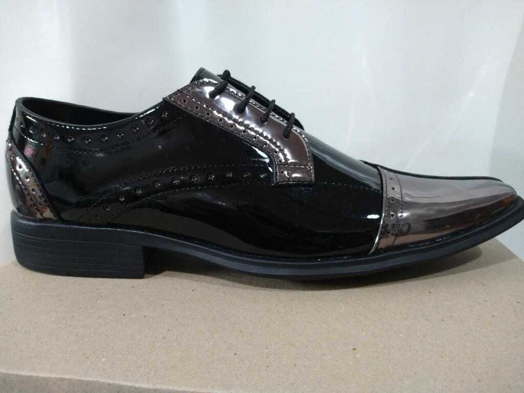 Zapato tipo Oxford de charol con acabado bicolor: negro y grafito metálico. Punta cuadrada, detalles brogue y cordones finos.