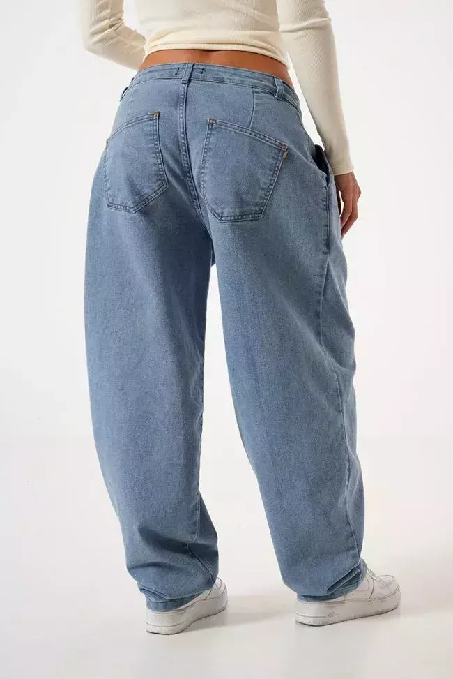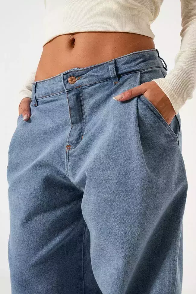 Pantalón baggy nevado de tiro medio/bajo con bolsillos delanteros y traseros. Detalle de pliegues delanteros. Cierre frontal con cremallera y botón metálico.