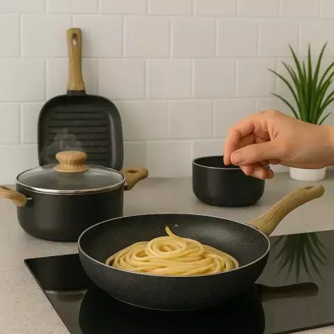 ¡Transforma tu cocina en un espacio moderno y elegante con este set de 9 ollas y sartenes antiadherentes! Su diseño combina estilo y funcionalidad, ofreciendo una experiencia de cocina práctica y sofisticada. Perfecto para quienes buscan versatilidad, estilo y practicidad al momento de cocinar, ya sea para preparar recetas sencillas del día a día o platillos más elaborados.