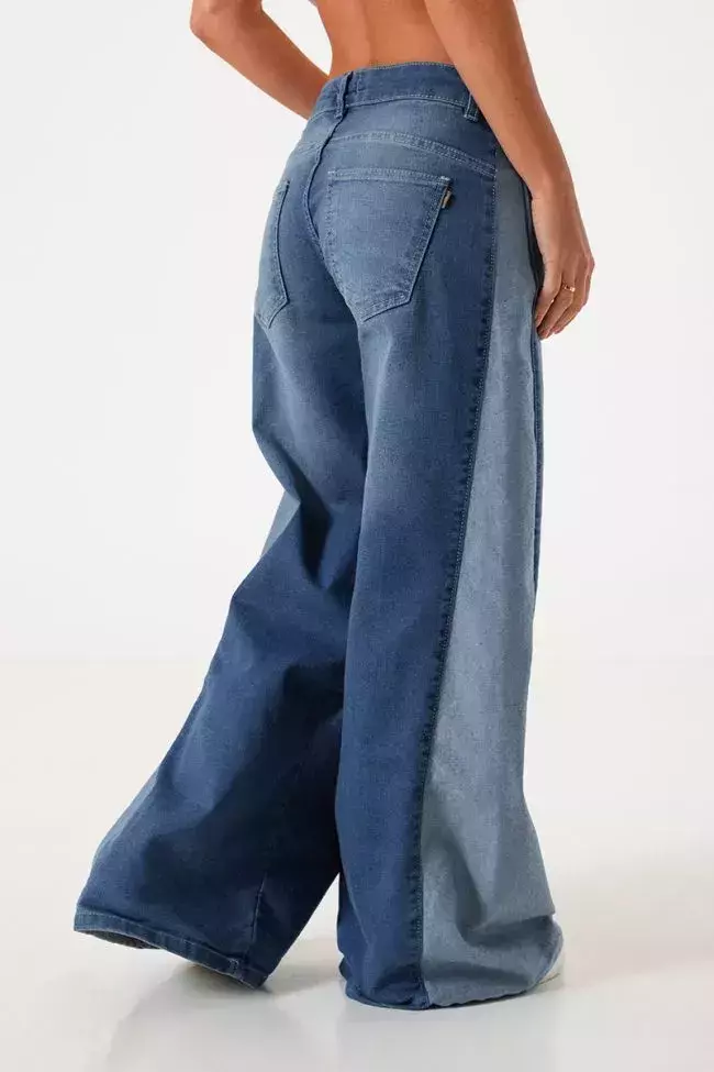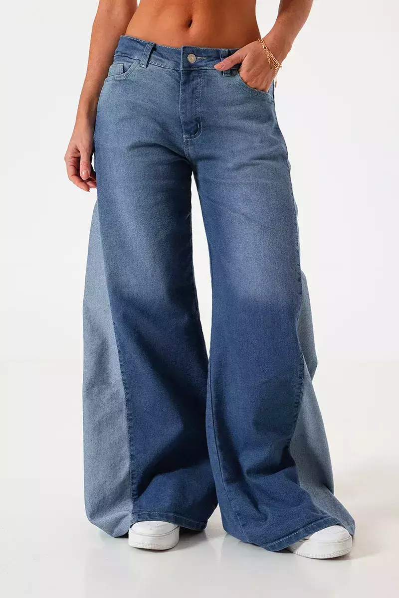 Wide Leg parche lateral de tiro medio/alto confeccionado en tela de jean que cede levemente, cuenta con bolsillos delanteros y traseros.